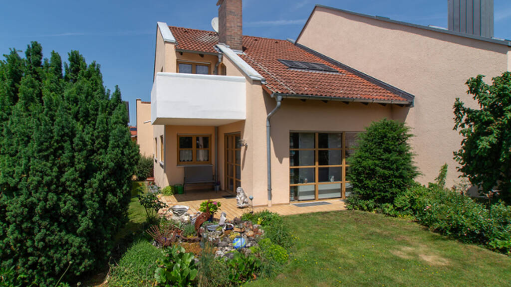 Garten und Terrasse liegen im Süden. Der Garten ist angelegt und gut eingewachsen. Die an das Haus gebaute, überdachte Garage hat Zugang zum Garten.