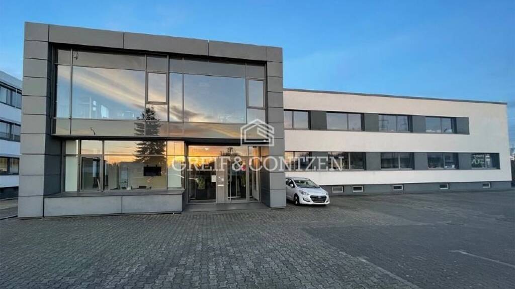 Die Gewerbeliegenschaft besteht aus vier separaten, miteinander verbundenen Hallenflächen sowie einem vorgelagerten Bürogebäude.
