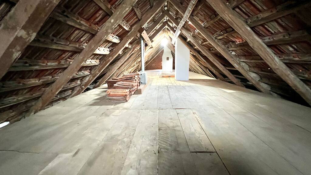 Obergeschoss: Galerie, vier Zimmer, Abstellraum, Flur (mit Einschubtreppe als Aufgang zum Spitzboden), WC (z.Zt. keine Toilette montiert) mit Zugang zum Stauraum (hierbei handelt es sich um die Ebene oberhalb der Garage)