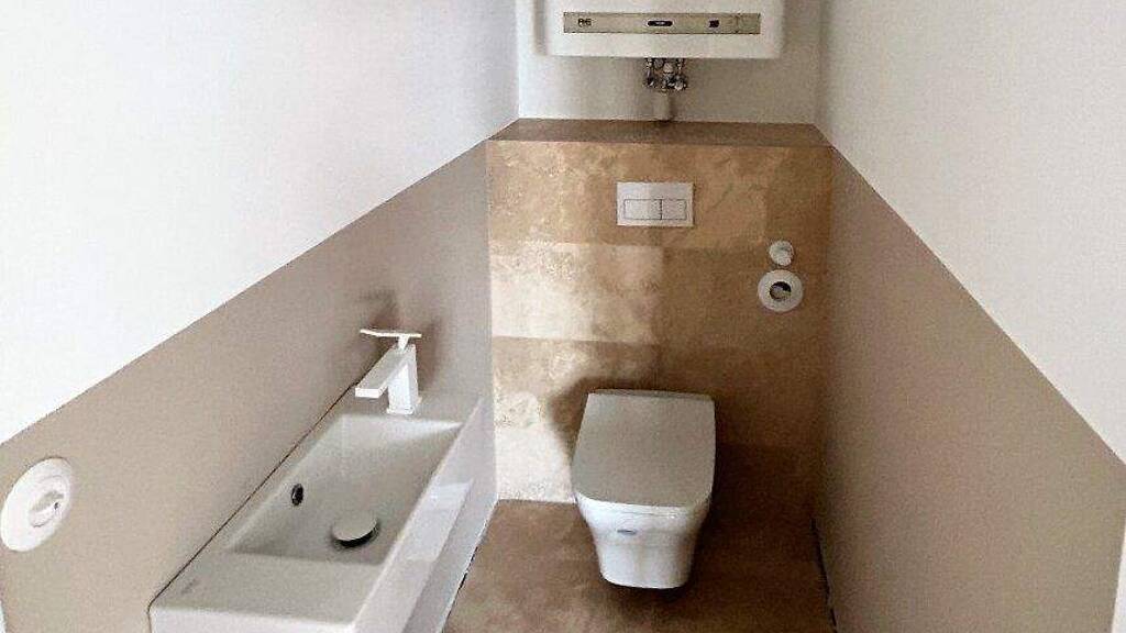 Die moderne Dusche und die effiziente Luftwärmepumpe unterstreichen die hochwertige Ausstattung dieser Wohnung.