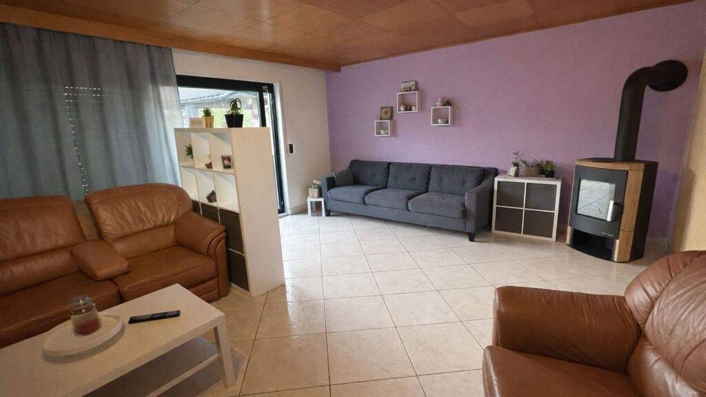Im Anbau der unteren Wohnebene befindet sich eine großzügige Wohn- und Esssituation mit angrenzender Küche. Von hier aus besteht ein direkter Zugang zu den Außenbereichen mit Balkon, Terrasse sowie dem Garten, wodurch die Räume einen offenen und familienfreundlichen Charakter erhalten. Dieser Bereich bildet den zentralen Lebensmittelpunkt des Hauses.