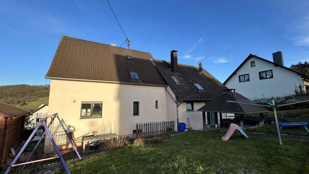 Dieses Ein- bis Zweifamilienhaus befindet sich in der Ortsgemeinde Hoppstädten-Weiersbach und bietet mit ca. 246 m² Wohnfläche jede Menge Platz und Gestaltungsmöglichkeiten. Durch das ansteigende Gelände sind die Räume des Kellergeschosses zur Straßenseite hin ebenerdig erreichbar, während sich zur Gartenseite die eigentliche Wohnebene entwickelt. Im Kellergeschoss befindet sich neben mehreren klassischen Kellerräumen auch eine integrierte Doppelgarage, welche direkt von der Straßenseite aus befahren werden kann.