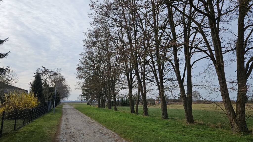 An die westliche Grundstücksecke Grenzt ein Stück Unland. Neben einigen Bäumen und Sträuchern die dort locker stehen findet man dann Richtung Norden eine kleine einstmals ordentlich angelegte Obstplantage.