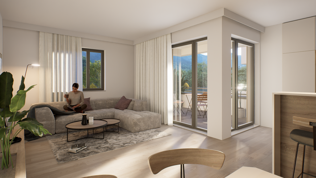 Der großzügige Wohn-Essbereich ermöglicht Ihnen entspannte Abende mit Ihren Gästen. Der angrenzende Balkon in Süd-Ausrichtung lädt zum Verweilen ein. Hier genießen Sie die Mittagssonne.