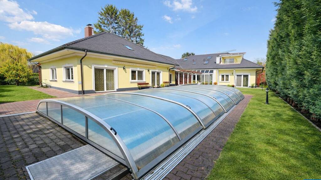Auch im Außenbereich setzt sich das exklusive Lebensgefühl fort: Der gepflegte Garten mit automatischer Bewässerung, großzügige Terrassenflächen und ein überdachter Swimmingpool (8 × 4 m) laden zu entspannten Stunden und geselligen Abenden ein.