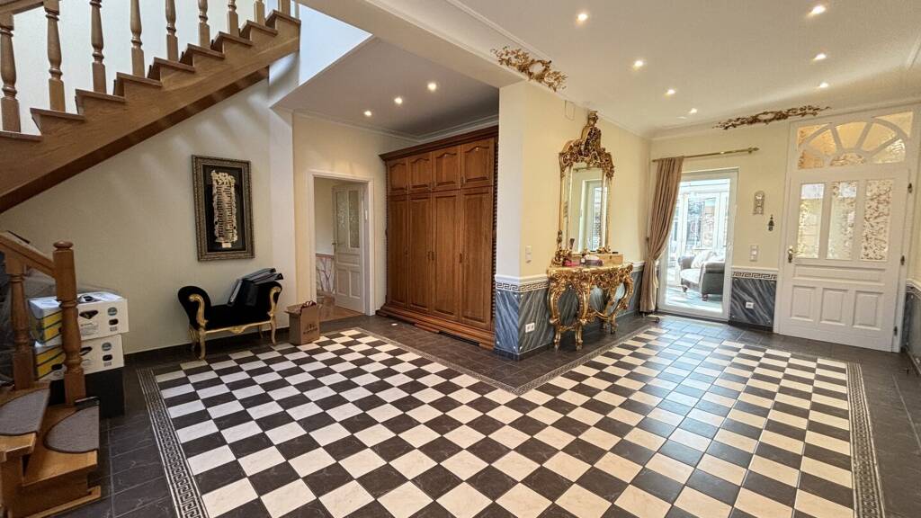 Im Inneren eröffnet sich ein Wohnkonzept für höchste Ansprüche: Edle Massivparkettböden im Fischgrätmuster, hochwertige Naturmaterialien wie Marmor und Granit, kunstvolle Details und großzügige Raumhöhen schaffen eine Atmosphäre zeitloser Eleganz. Das Herzstück des Hauses bildet der lichtdurchflutete Wohnbereich mit offenem Kamin, angrenzendem Wintergarten und direktem Zugang zur Terrasse.