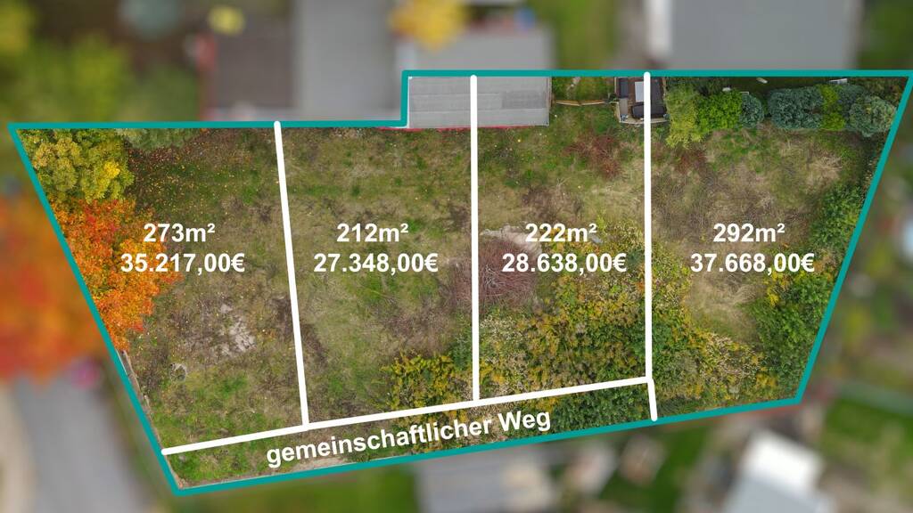 TeilgrundstĂźcke verfĂźgbar: ⢠212 m² â 27.348 ⏠⢠222 m² â 28.638 ⏠⢠273 m² â 35.217 ⏠⢠292 m² â 37.668 ⏠⢠zzgl. zum Kaufpreis eines GrundstĂźckes kommt der Anteil des Gemeinschaftsweges hinzu. Dies sind 2.676,75 ⏠pro GrundstĂźck.