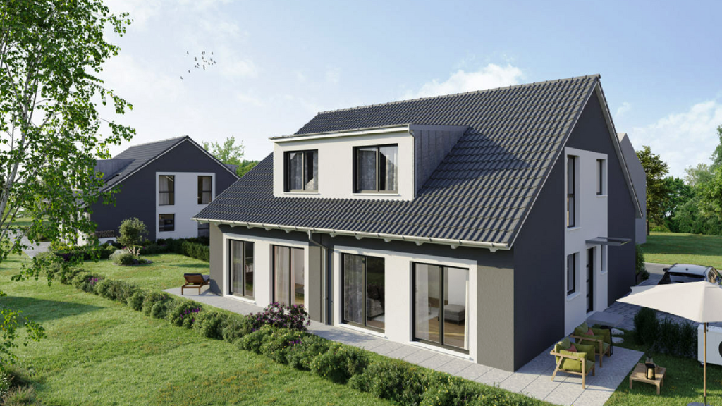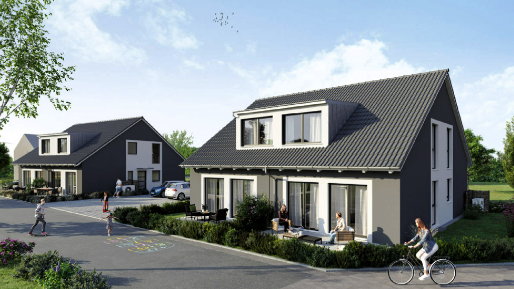 Zum Verkauf stehen vier Doppelhaushälften, die sich durch ihre ansprechende Architektur mit Satteldächern und Gauben auszeichnen.