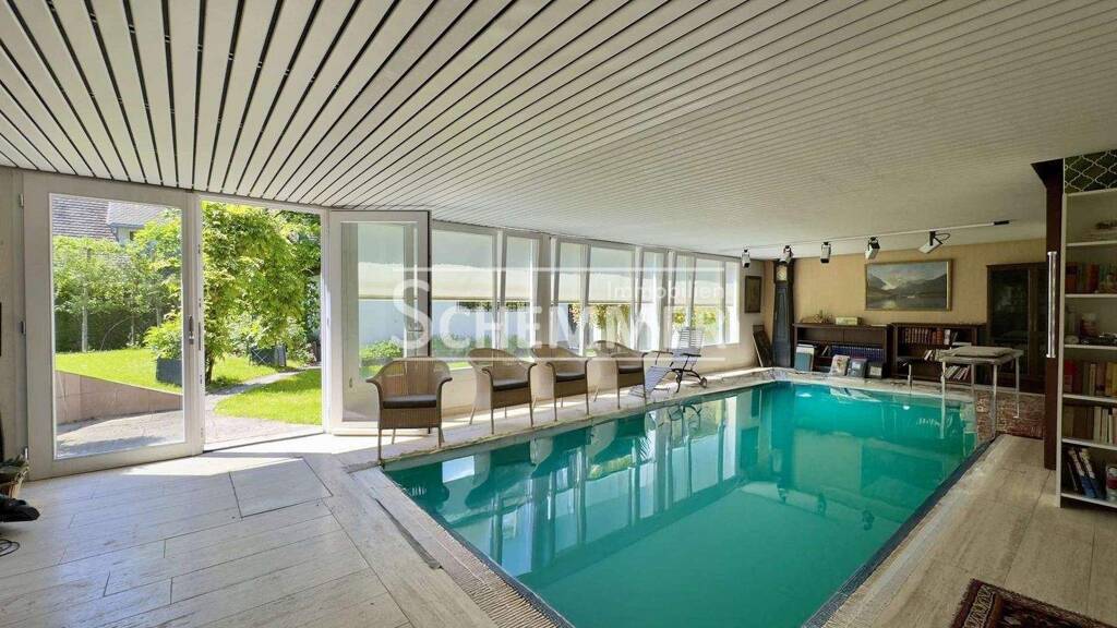 Das Untergeschoss bietet mehr als nur klassische Nutzflächen: Besonders hervorzuheben ist der großzügige, tageslichthelle Raum mit direktem Zugang in den Garten, in dem sich einst ein Schwimmbad befand (derzeit nicht aktiv). Heute eröffnet dieser Bereich vielseitige Nutzungsmöglichkeiten - sei es als Fitnessraum, Atelier. Spielzimmer oder Sie aktivieren das Schwimmbecken. Ergänzt wird das Untergeschoss durch zwei weitere Kellerräume, eine Waschküche, ein Bügelzimmer sowie einen Heizungs- und Werkstattraum.