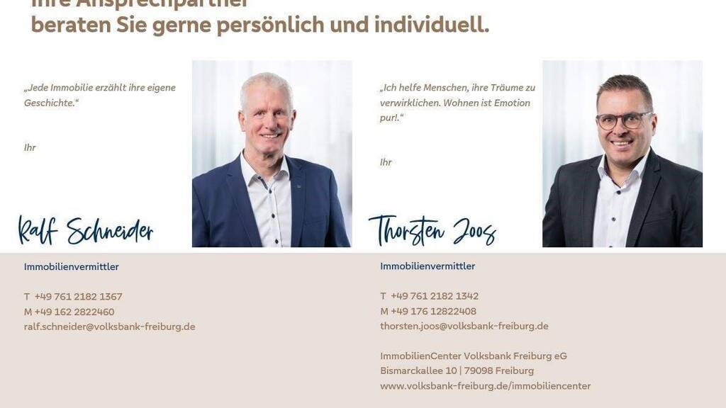 Die Angaben im Exposé stammen ausschließlich vom Bauträger. Eine Gewährleistung für die darin enthaltenen Angaben kann seitens der Volksbank Freiburg eG nicht übernommen werden. Insbesondere wird darauf hingewiesen, dass sich die Tätigkeit der Volksbank Freiburg eG auf den bloßen Immobilienvertrieb beschränkt, im Falle eines Erwerbs von Eigentum zu Anlagezwecken ist mit der Vermittlung der Wohnung keine Anlagenberatung verbunden, dass Immobiliencenter der Volksbank Freiburg eG hat die Ertragsmöglichkeiten und insbesondere auch die steuerlichen Möglichkeiten in diesem Zusammenhang nicht geprüft und kann hierfür keine Haftung übernehmen.