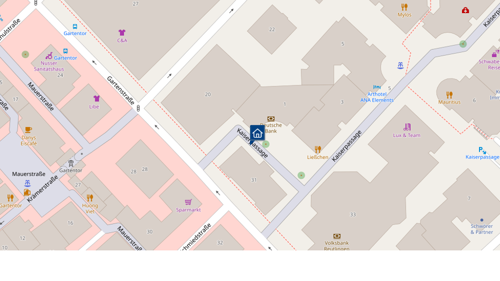 Der Tiefgaragenstellplatz befindet sich in der Kaiserpassage 13, mitten im Herzen von Reutlingen. Die Lage zeichnet sich durch ihre unmittelbare Nähe zur Fußgängerzone, zahlreichen Einkaufsmöglichkeiten, Cafés und Restaurants aus.