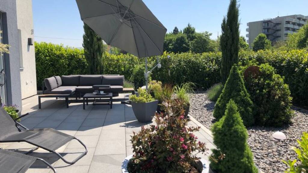 Das moderne Einfamilienhaus wurde in Bad Krozingen nahe des Kurparks in guter Lage mit freiem Blick auf den Schwarzwald erstellt. Der Garten wurde mit einer Sichtschutzbepflanzug, pflegeleicht angelegt. Alle Pflanzen werden automatisch bewässert. Der Hauszugang ist barrierefrei. Sonne pur mit einer supergroßen erhöhten 30 QM Südterrasse sowie einer 14 QM großen Frühstücksterrasse im Osten.