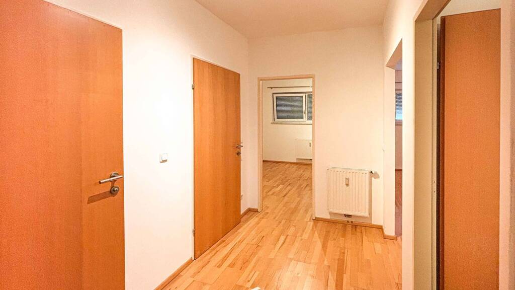Beim Betreten der Wohnung gelangen Sie in einen zentralen Vorraum, der alle Räume miteinander verbindet. Auf der rechten Seite befindet sich das kompakte, innenliegende Badezimmer mit Dusche und Waschmaschinenanschluss. Links davon liegen das separate WC und ein kleiner Abstellraum. Geradeaus liegt das Schlafzimmer.