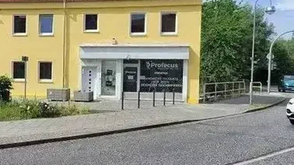 Er verfügt über eine große Schaufensterscheibe, eine Eingangstüren und drei Kunststofffenster.