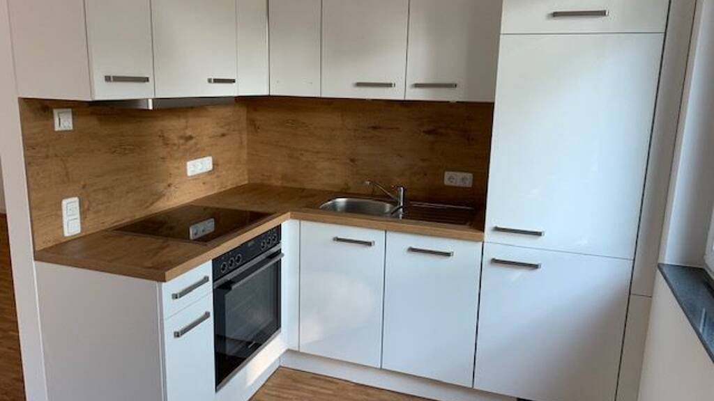 Des Weiteren ist die Wohnung mit einer Einbauküche ausgestattet. Diese beinhaltet einen Geschirrspüler, einen Backofen mit Cerankochfeld, eine Dunstabzugshaube und einen Kühlschrank mit integriertem Gefrierfach.