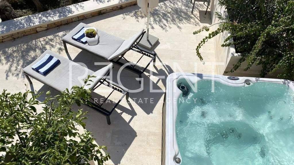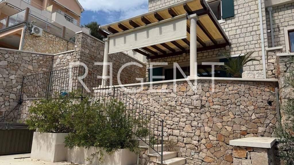 Zum Verkauf steht diese einzigartige freistehende Villa mit einer Fläche von 125 m², die in erster Reihe zum Meer gebaut wurde. Sie befindet sich auf einem Grundstück von 250 m² in einer ruhigen Bucht unweit des Zentrums von Milna auf der Insel Brac. Milna liegt an der Westküste der Insel Brac und ist bekannt für einen der sichersten und schönsten Naturhäfen an der Adria. Von Split aus ist es etwa eine Stunde Fährfahrt nach Supetar, gefolgt von einer kurzen Autofahrt. Das Anwesen erstreckt sich über mehrere Etagen und bietet 4 Zimmer, großzügige Terrassen und Meerblick, was eine ideale Kombination aus authentischem mediterranem Ambiente und funktionalem Wohnraum darstellt. Im Erdgeschoss befinden sich ein elegant eingerichtetes Wohnzimmer mit Küche und Essbereich sowie eine Gästetoilette. Vom Wohnbereich aus gelangt man auf eine überdachte Terrasse mit elektrischer Markise. Eine Außenterrasse mit Jacuzzi, Dusche und privatem Zugang zu einem gepflegten Strand mit natürlichen Steinplateaus und Bootsanlegeplatz rundet das Erlebnis am Meer ab. In den oberen Etagen befinden sich 2 Schlafzimmer, darunter das Hauptschlafzimmer mit eigener Terrasse und Meerblick, was diese Villa zu einem komfortablen Ort zum dauerhaften Wohnen und für einen erstklassigen Urlaub macht. Die Villa Tramonto strahlt in jedem Detail anspruchsvolle Einfachheit und Qualität aus - die Fassade und die Innenelemente sind mit authentischem Brac-Stein verkleidet, und hochwertige PVC-Tischlerei verleiht Wärme und ein modernes Aussehen. Der Ort liegt in einer tiefen und geschützten Bucht, was Ruhe und einen angenehmen Aufenthalt während des ganzen Jahres gewährleistet. Die Nähe zum Meer, die gepflegte Uferpromenade und die natürliche Umgebung machen es attraktiv für einen Urlaub, aber auch für einen dauerhaften Aufenthalt. In Milna gibt es Restaurants, Cafés, Geschäfte und andere grundlegende Einrichtungen, die für das tägliche Leben benötigt werden. Es ist von kleineren Buchten und sauberem Meer umgeben, was allen, die Privatsphäre und ein authentisches mediterranes Ambiente suchen, einen zusätzlichen Wert bietet. Der Zugang zum Anwesen ist asphaltiert, und ein privater Parkplatz bietet Platz für zwei Autos. Für weitere Informationen kontaktieren Sie uns bitte.