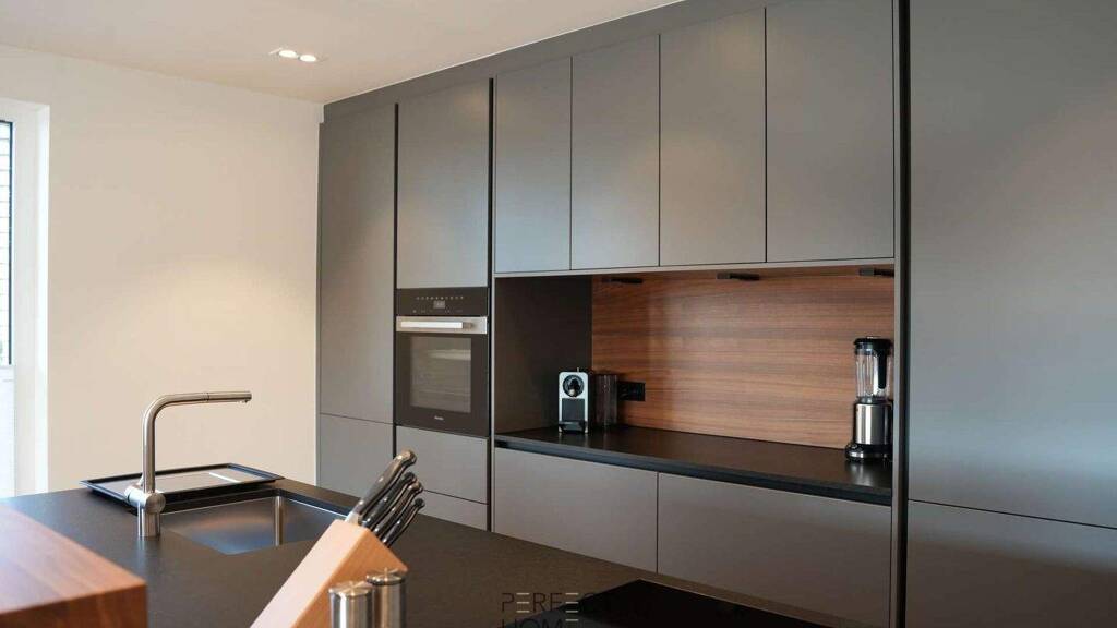 Die offene Einbauküche mit hochwertigen Miele-Geräten und integriertem Bora-Dunstabzug fügt sich harmonisch in das puristische Gesamtkonzept ein. Funktionalität und Ästhetik stehen hier gleichberechtigt nebeneinander.