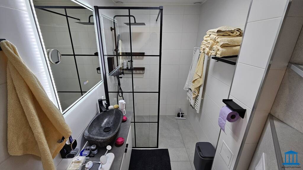Eines der Highlights dieser Eigentumswohnung ist sicherlich das moderne, im Industrial-Style gestaltete Badezimmer, in welchem sich eine große, offene (Regen-) Dusche, ein Waschbecken mit beleuchteten Spiegel sowie eine Toilette befinden.
