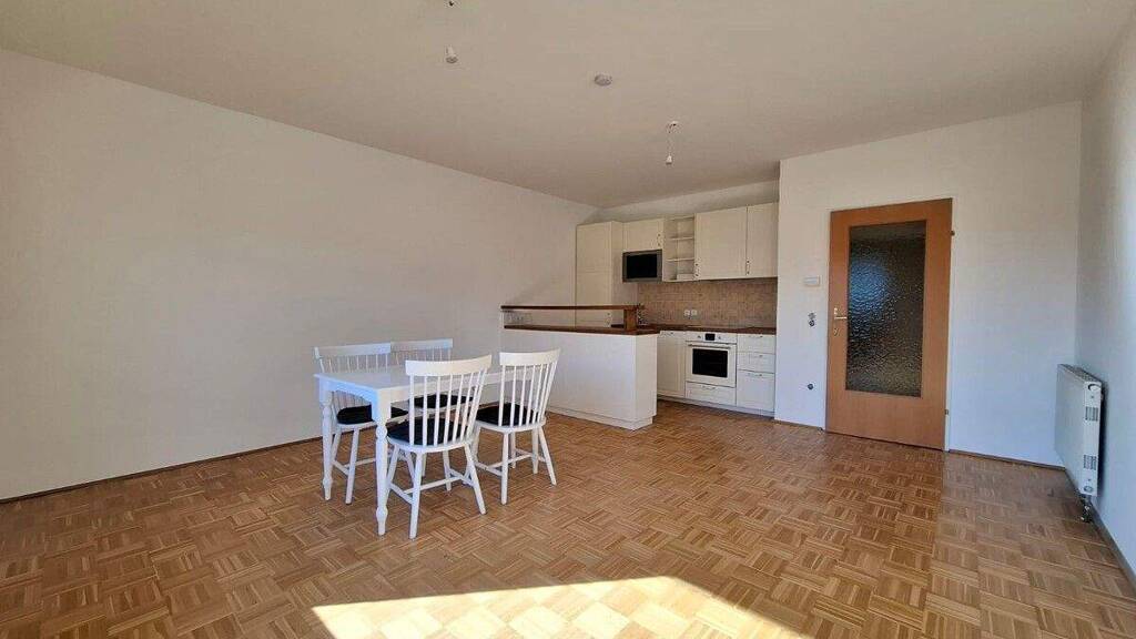 Der sonnige Wohn- und Essbereich bildet das Herzstück der Wohnung. Von hier aus gelangen Sie direkt auf eine der beiden Loggien (5,70 m²), die zum Entspannen im Freien einlädt. Die vorhandene Küche ist funktional ausgestattet und fügt sich harmonisch in den Wohnbereich ein.