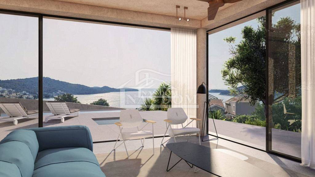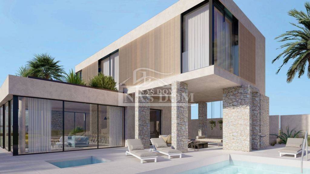 Vila se nalazi na mirnoj lokaciji od mora udaljena svega 200 m . Planirani rok zavrsetka gradnje je lipanj 2025. Cijena NA UPIT.