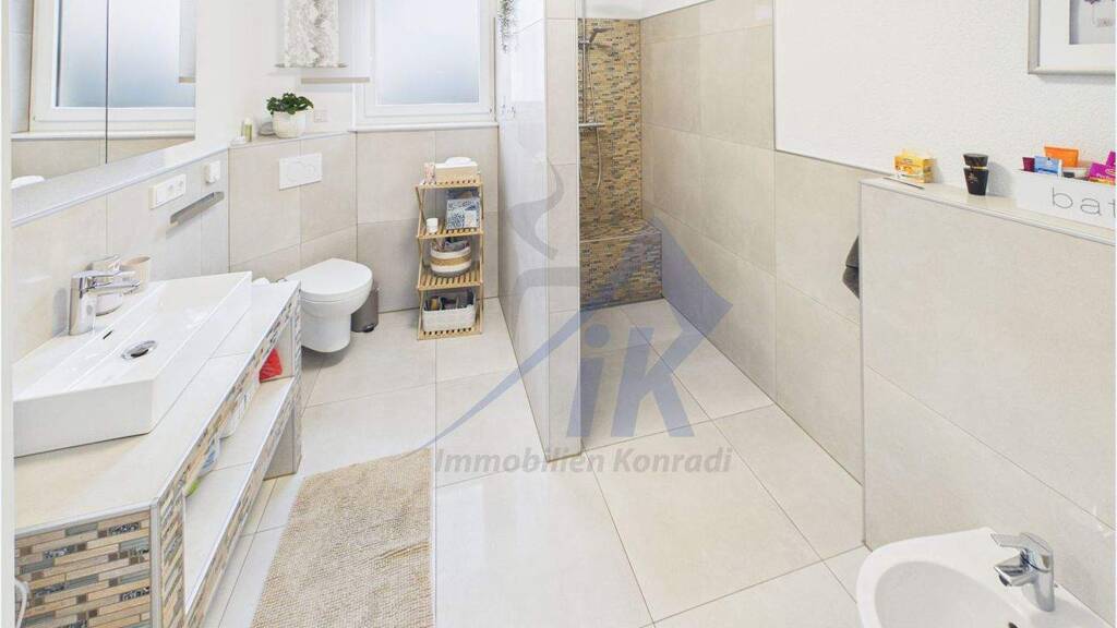 Die modernen Badezimmer mit bodengleichen Duschen, hochwertigen Fliesen und klarer Gestaltung verleihen der Immobilie einen gehobenen Wohnkomfort. Der Außenbereich bietet ausreichend Platz für Familie, Freizeit und Erholung.