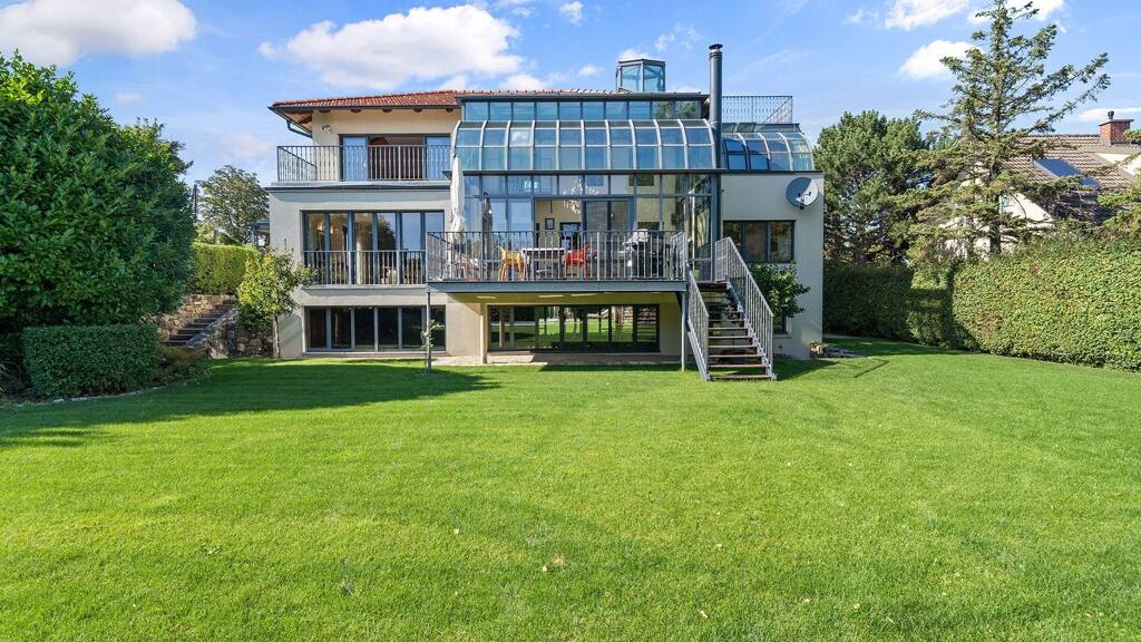 Die hier angebotene Villa lässt keine Wünsche offen. Auf einem großzügigen Grundstück von rund 952 m² entfaltet sich eine architektonische Meisterleistung, die zeitlose Eleganz mit modernster Technik und erlesensten Materialien verbindet. Auf einer Wohnfläche von rund 312 m² präsentiert sich das Haus in einer durchdachten, repräsentativen Raumaufteilung. Im Erdgeschoss befinden sich neben dem Eingangsbereich mit Garderobe ein weitläufiges Wohnzimmer mit offenem Kamin, eine top ausgestattete Küche mit Kücheninsel und Weinkühlschrank und ein Büro. Abgerundet wird dieses Stockwerk von einem der zahlreichen Highlights des Hauses - dem fünf Meter hohen Wintergarten auf der Südseite. Im Obergeschoss befinden sich zwei gespiegelte, lichtdurchflutete Schlafzimmer, die über ein eigenes Badezimmer verfügen. Durch eine zweiflügelige Tür betritt man den Elternwohnbereich, der aus einem großzügigen Schrankraum, einem luxuriösen Badezimmer und dem Master-Bedroom mit direkt angrenzender Terrasse besteht. Von dieser kann man den Ausblick über das eigene Grundstück sowie auf die direkt anschließenden Weingärten genießen. Das Dachgeschoss bietet eine einzigartige rund 28 m² große Aussichtsterrasse von der man einen atemberaubenden Fernblick bis nach Bratislava hat. Im Untergeschoss befinden sich ein privater Fitnessbereich, ein Heimkino, das keine Wünsche offen lässt und eine Sauna mit Sanariumfunktion. Neben den hochwertigen Materialien, wie Eichenparkettböden von Weitzer oder Natursteinböden in den Bädern, verfügt das Haus auch über moderne technologische Finessen, wie einem Smart-Home-System, Klimaanlagen und einer kontrollierten Wohnraumlüftung. Das angebotene Objekt ist ein Rückzugsort, der höchste Lebensqualität, Privatsphäre und luxuriöse Ausstattung in sich vereint. Lassen Sie sich persönlich bei einer Besichtigung von den zahlreichen Vorteilen dieser Immobilie überzeugen.