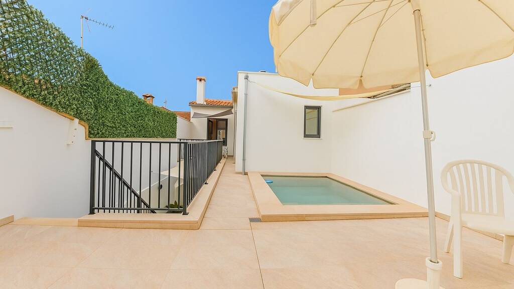 Vom Wohn- und Küchenbereich aus öffnet sich der Zugang zum Patio, der als sommerlicher Essbereich genutzt werden kann. Der geschützte Innenhof bietet Sitzgelegenheiten und verbindet das Haupthaus mit einem Annex, der als Hobbyraum oder Atelier vielfältig genutzt werden kann. Über eine Außentreppe gelangt man von hier zum Pool im Obergeschoss, der sich auf der Rückseite des Hauses befindet und eine private, sonnige Oase bildet.