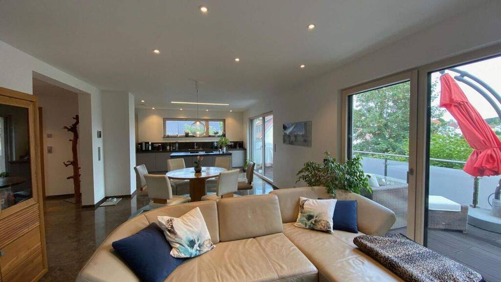 Sie erwarten beste Ausstattung, ausschließlich hochwertige Materialien und eine ruhige Lage am Bodensee? Dann wird Ihnen diese sensationelle Immobilie zusagen. Hier im Obergeschoss wurde mit viel Liebe zum Detail, mit besten Materialien von den Eigentümern auf höchsten Komfort, Exklusivität und Qualität ihre Traumwohnung erstellt. Die moderne Küche mit Kücheninsel zeigt sich offen zum Ess-/Wohnzimmer und glänzt mit Eleganz und Exklusivität. Das gesamte 1.Geschoss sowie das luxuriöse Badezimmer im Obergeschoss sind mit Muschelkalk-Goldbank-Marmor ausgelegt. Eine wunderschöne, massive Bambus-Harfen-Treppe führt Sie in die obere Etage. Dort finden Sie harmonischen Bambus-Parkett in coffee geölt, passend zu den Echtholztüren. Die Badezimmer sind mit Keramiken von Villeroy & Boch ausgestattet und verfügen über maßgefertigte Massivholzmöbel in Eiche. Im Dachgeschoss erstrahlen die Räume mit schönen Sichtbalken und einer Deckenhöhe von über 5 Metern. Dort befindet sich auch das große Hauptschlafzimmer mit angrenzender begehbarer Ankleide. Alle Fenster, meist bodentief und mit elektrischen Jalousien ausgestattet, sind von bester Qualität und in Holz-Alu-3-fach-Verglasung ausgeführt. Das gesamte Wohnambiente wurde mit viel Liebe zum Detail auf RAL-Farben abgestimmt. Im Untergeschoss befindet sich der Versorgungsraum mit der Technik für die Luftwärmepumpe und die PV-Anlage sowie die Steuerung der Fußbodenheizung/-Kühlung. Zudem wurde im gesamten Haus ein Be- und Entlüftungssystem installiert. Dank der Kombination aus Luftwärmepumpe und PV-Anlage haben Sie einen sehr geringen Energieverbrauch. Diese außergewöhnliche Immobilie mit luxuriöser Ausstattung lässt sich nicht in eine Schublade stecken.