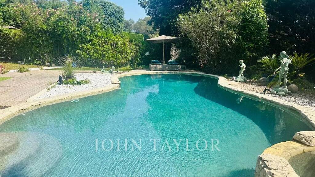 Piscine chauffée Diffazur, jardin paysagé avec fontaine et bassin à carpes koï, espaces détente variés et maison de gardien indépendante.