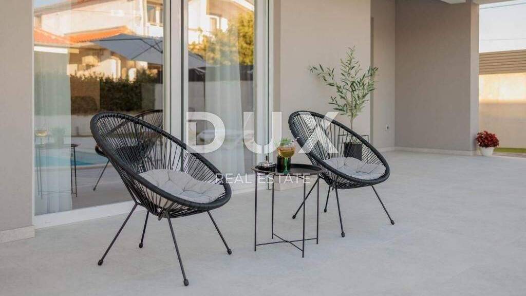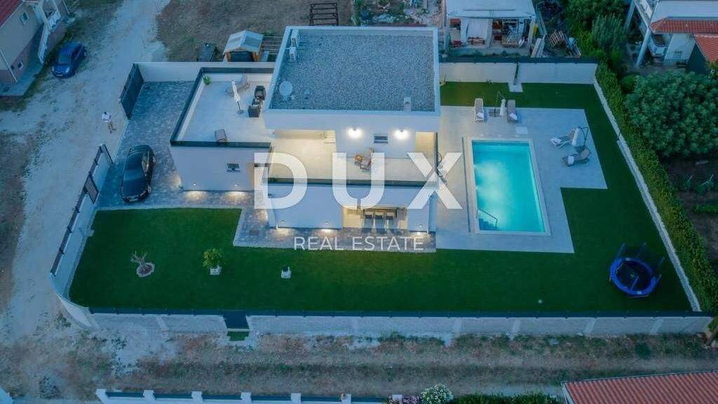 Zum Verkauf steht eine wunderschöne Villa mit Pool in einem ruhigen Teil von Vrsi, nur wenige Autominuten vom historischen Nin und der Stadt Zadar entfernt. Dieser modern eingerichtete Neubau bietet die perfekte Kombination aus Luxus, Komfort und Funktionalität und ist ideal für den Tourismus oder als private Oase der Entspannung. Die Villa erstreckt sich über ein großzügiges Grundstück von 768 m2 und besteht aus Erdgeschoss und Obergeschoss. Sie ist komplett möbliert und mit hochwertigen Materialien und Geräten ausgestattet. Der Innenbereich umfasst drei geräumige Schlafzimmer, drei moderne Badezimmer, ein elegantes Wohnzimmer, eine voll ausgestattete Küche und ein Esszimmer. Jedes Zimmer verfügt über eine eigene Klimaanlage für maximalen Komfort das ganze Jahr über. Ein besonderes Erlebnis bieten die überdachte Terrasse zum Entspannen am Pool sowie die Dachterrasse mit Blick auf die Umgebung, ideal für abendliche Zusammenkünfte. Eine Sauna ist ebenfalls in Vorbereitung, was den Luxus noch weiter steigert. Draußen gibt es einen angelegten Garten mit viel Platz zum Genießen sowie fünf Parkplätze und eine Garage. Vrsi ist ein attraktiver und dennoch ruhiger Ort, bekannt für sein klares Meer, zahlreiche Strände und unberührte Natur. Es liegt nur wenige Kilometer vom königlichen Nin mit seinem reichen kulturellen Erbe und seinen Sehenswürdigkeiten und nur 20 Autominuten von Zadar entfernt, einer Stadt mit einem pulsierenden Nachtleben, einer guten Gastronomie und einem internationalen Flughafen. Eine perfekte Gelegenheit für alle, die ein Traumhaus oder eine erstklassige Investition im Tourismus suchen. Für weitere Informationen und einen Besichtigungstermin kontaktieren Sie uns bitte - diese Gelegenheit sollten Sie sich nicht entgehen lassen!