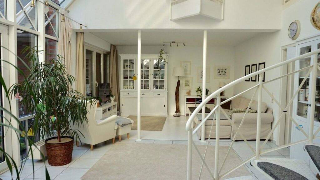 Das 1989 fertiggestellte Objekt liegt am Ende einer wenig befahrenen Sackgasse und wurde von einem örtlichen Bauunternehmer grundsolide, mit hochwertigen Materialien und großzügigen Raumaufteilungen für seine Familie gebaut. 1999/2000 ist das Haus mit Geschmack, Geschick und liebevollen Details zu einem Dreiparteienhaus umgebaut worden.