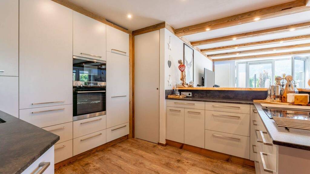 Die moderne, maßgeschneiderte Einbauküche ist ein wahres Schmuckstück und perfekt in den Wohnbereich integriert. Ausgestattet mit hochwertigen Geräten und cleveren Details lässt sie keine Wünsche offen - ideal für alle, die leidenschaftlich gerne kochen und ihre Gäste stilvoll bewirten möchten.
