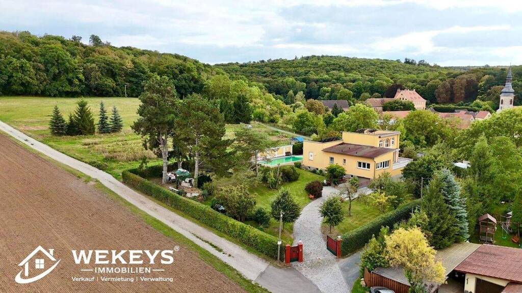 Genießen Sie die wundervolle Aussicht über die Ortschaft und weit darüber hinaus. Große Rundbogenfenster sorgen für lichtdurchflutete Räumlichkeiten. In Verbindung mit den weißen Säulen am Haus, entsteht ein sehr angenehmes Zusammenspiel mit leicht toskanischer Anmutung. Bisher wurde das Haus als Wochenendgrundstück und Gästehaus für private Veranstaltungen genutzt. Für diesen Zweck eignet es sich optimal, da sich im Souterrainbereich eine lange Gästetafel und Platz für ein Buffet, eine zweite Küche, sowie kühle Lagerräume und eine Zufahrt über die Garage, befinden.