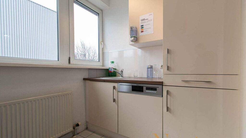 Neben der eigenen Bürofläche stehen auf diesem Stockwerk eine Gemeinschaftsküche sowie ein Damen- und ein Herren-WC zur Verfügung, die von allen Mietern im 1. Obergeschoß genutzt werden.