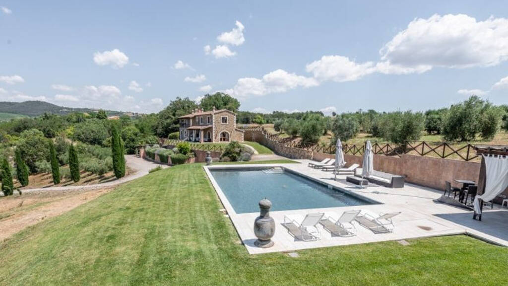 Das Anwesen ist von 2 Hektar Privatgrundstück umgeben, darunter Olivenhaine, Gemüsegärten und Wälder. Der 14x7 m große Pool ist umgeben von einem atemberaubenden Panoramablick auf die sanften Hügel der Toskana bis hin zum Monte Argentario und zur Insel Giglio – perfekte Sonnenuntergänge garantiert.