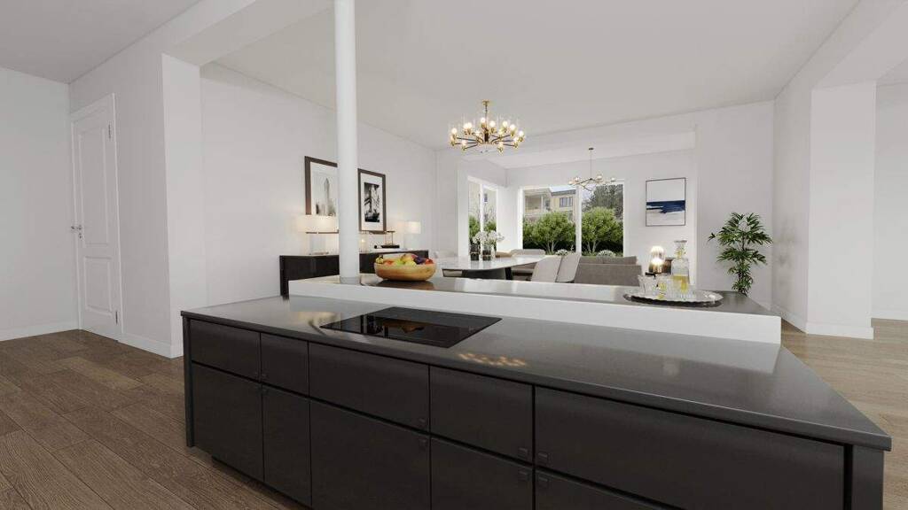 Über eine weitläufige Diele von erschließt sich der offen gestaltete Wohnbereich. Das Wohn/Esszimmer mit integrierter Küche misst großzügige ca. 63 m² und bildet das kommunikative Zentrum und zugleich das Herzstück der Wohnung. Großflächige Verglasungen sorgen für exzellente Belichtung, verleihen dem Raum gestalterische Tiefe und schaffen eine harmonische Verbindung zwischen Innenraum und Garten.