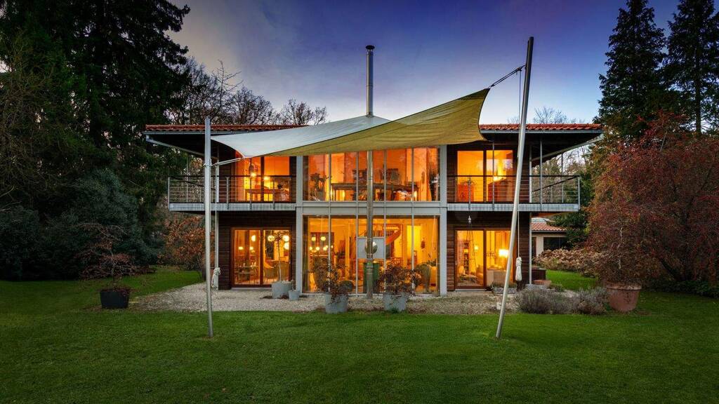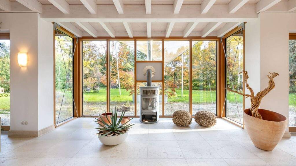 Helles Fichtenholz verbindet sich mit Naturstein, atemberaubende Glasfronten holen viel Licht und Sonne ins Haus und eröffnen überwältigende Panoramablicke in die Natur. Durch Deckenhöhen bis ca. 5,45 Meter entsteht außergewöhnliche Luftigkeit. Dieses Voll-Wert-Haus von Baufritz wurde in nachhaltiger Holz-Bauweise errichtet und begeistert durch seine hohe Qualität, den ökologischen Anspruch und eine bestechende Ästhetik; 2023 wurde das Öko-Haus-Unternehmen Baufritz mit dem Bundes-Umweltpreis ausgezeichnet.
