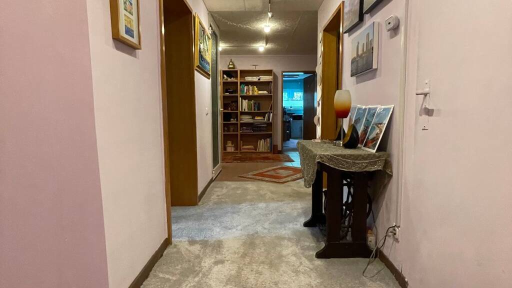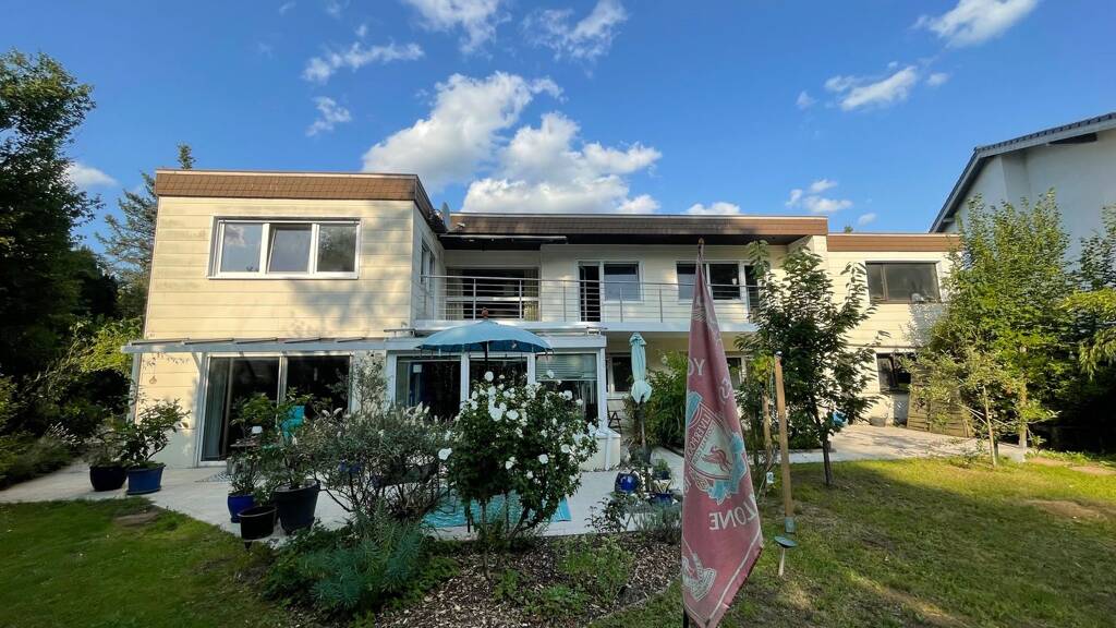 Das Haus wurde 1970 erbaut und weist noch typische Stilelemente aus der damaligen Zeit auf. Vom überdachten Hauszugang gelangt man in den großen Windfang mit Garderobenbereich und Gäste-WC. Im Anschluss befindet sich eine große Diele mit Panoramafenster zum Balkon. Von hier aus hat man Zugang zum Schlaftrakt, dem Wohnzimmer sowie zum Treppenabgang zum abgeschlossenen Gartengeschoss. Das Wohnzimmer hat einen direkten Zugang zum überdachten großen Südwest-Balkon. Ein Durchgang verbindet das Wohn- mit dem Esszimmer und die vorgelagerte Küche mit Abstellraum, welche auch vom Windfang zugänglich ist. Im Schlaftrakt befinden sich straßenseitig ein großes Tageslichtbad mit Wanne und Dusche sowie ein Kinderzimmer, gartenseitig liegen ein weiteres Kinderzimmer und das Elternschlafzimmer mit jeweils einem Ausgang zum Balkon. Die Wohnung im Gartengeschoss wird entweder über den innenliegenden Treppenabgang oder seitlich neben dem Haus über einen Gartenweg erschlossen. Hier gelangt man zuerst in den schönen Wintergarten und von dort ins Wohnzimmer mit offener Küche und auch in die Diele. Die Küche hat ebenfalls einen Zugang zur Diele, welche auch das Arbeitszimmer, 3 Schlafzimmer und ein Wannenbad erschließt. Auf dieser Ebene befinden sich der Heizraum, eine Waschküche und ein Kellerraum. An das Haus angebaut ist eine Doppelgarage, darunter befinden sich gartenseitig ein Geräteraum und der Öltankraum. Die Wohnung im Gartengeschoß verfügt über eine schöne Terrasse sowie einen überdachten Bereich unterhalb des Balkons. Am hinteren Ende des Grundstücks steht noch ein Gartenhaus und eine Gartenlaube zum Verweilen. Dieser Bungalow eignet sich als Einfamilienwohnhaus mit Einliegerwohnung/Büro oder als Mehrgenerationenhaus.
