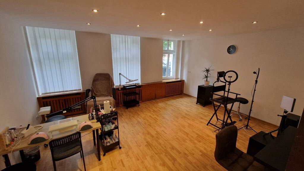 Die zweite Einheit wird als Kosmetikstudio betrieben und umfasst ca. 57,7 m² bei einer monatlichen Kaltmiete von 425 €. Hier ist ein Parkettboden verlegt, der den Räumen eine warme und einladende Atmosphäre verleiht. Das Badezimmer ist gefliest und funktional ausgestattet.