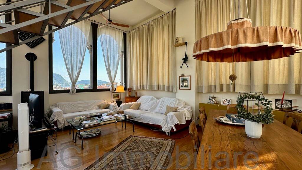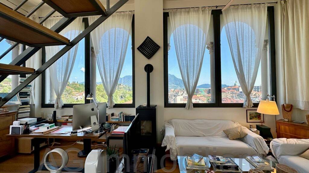 Über eine Innentreppe gelangen wir in das schöne, vollständig verglaste, sehr helle Wohnzimmer, von dem aus wir einen wunderschönen Blick auf Verbania, die Basilika San Vittore und einen Teil des Sees genießen können.