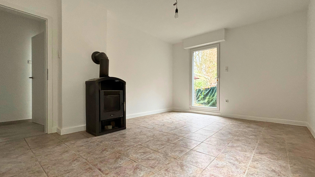 Betritt man die Wohnung, empfängt einen sofort ein offenes, freundliches Raumgefühl. Das Wohnzimmer wirkt weitläufig und lichtdurchflutet, während der Kamin das Herzstück bildet und an kühlen Tagen wohlige Wärme und Gemütlichkeit spendet. Man kann sich direkt vorstellen, wie man abends mit einer Decke und einem Buch auf dem Sofa sitzt und das leise Knistern des Feuers genießt. Vom Wohnzimmer aus führt der Blick hinaus auf die Terrasse und den Garten, der mit einem praktischen Geräteschuppen ausgestattet ist. Ein separater Hauseingang vom Garten aus verleiht der Wohnung zusätzlich eine angenehme Eigenständigkeit.