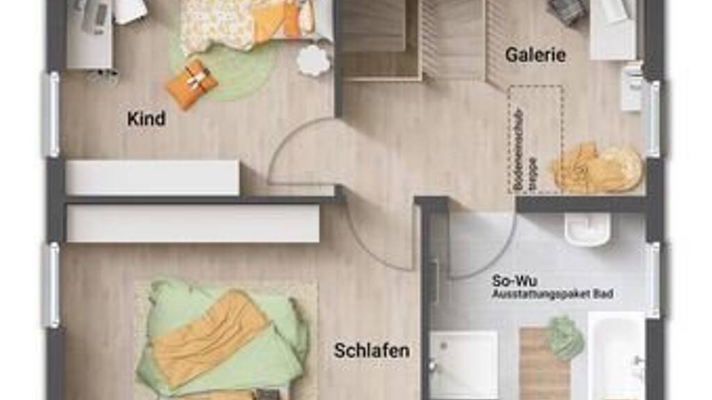 Das Obergeschoss begrüßt dich mit einer Galerie für deine Hobbys oder deinen flexiblen Arbeitsbereich. Ein Bad, Kinder- und Schlafzimmer runden das Dachgeschoss ab.