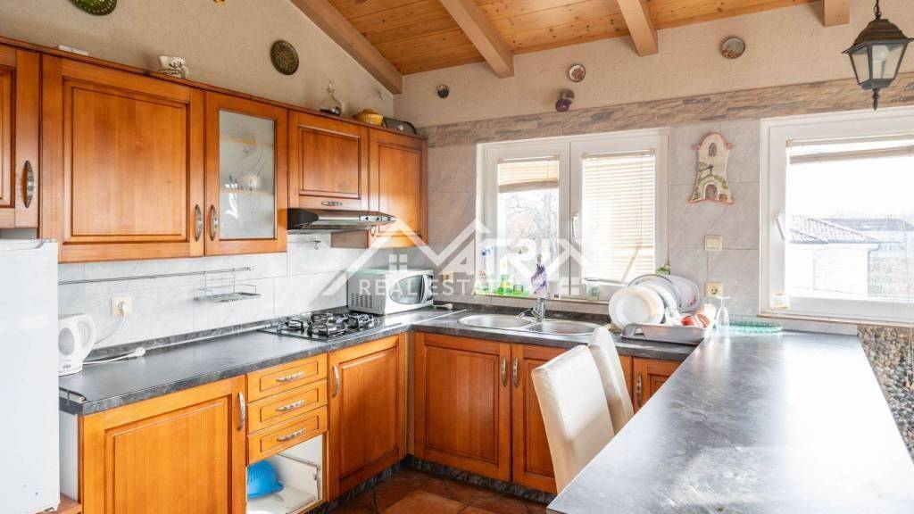 Zum Verkauf steht eine großzügige Wohnung im ersten Stock eines Einfamilienhauses. Im Erdgeschoss befinden sich drei kleinere Wohneinheiten, während diese größere Wohnung den gesamten ersten Stock einnimmt, was ein hohes Maß an Privatsphäre und Ruhe gewährleistet.