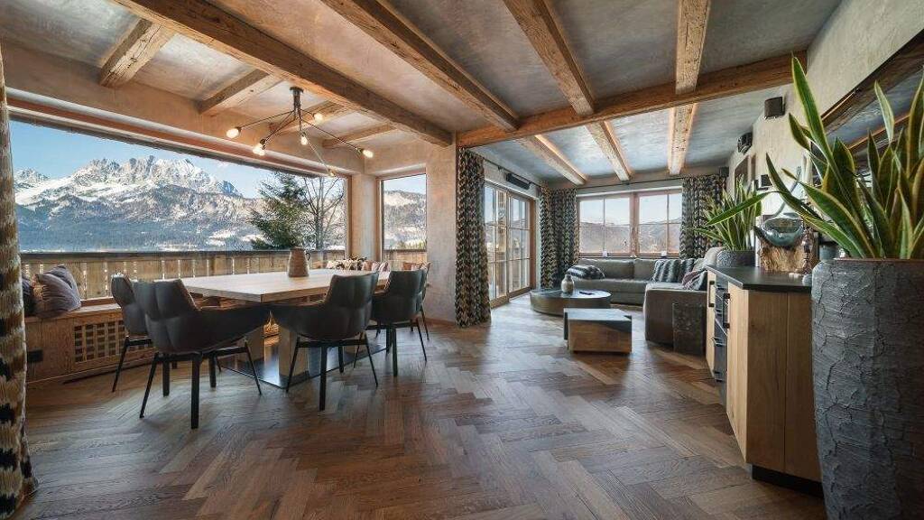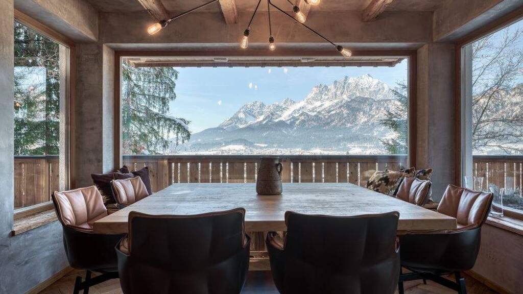Ein besonderes Highlight ist der exklusive Wellnessbereich mit Sauna und Indoor-Pool, der zu jeder Jahreszeit private Entspannung auf höchstem Niveau bietet. Großzügige Fensterflächen eröffnen einen atemberaubendem Panoramablick auf den Wilden Kaiser und holen die alpine Natur direkt ins Haus.