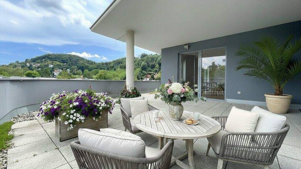 Leben Sie auf der Terrasse Ihren grünen Daumen aus: Palmen und Olivenbäume, ein Hochbeet mit Kräutern oder bunte Blühpflanzen - gestalten Sie sich Ihre neue und großzügige Terrasse ganz nach Ihrem Geschmack. Falls ein Unwetter im Anmarsch ist, finden Ihre Pflanzen unter der Überdachung der Terrasse einen sicheren Platz. Das Abstellkammerl (Zugang außen) mit Wasseranschluss bietet zudem im Winter einen guten Platz für Ihre Blumen. Sie können es gar nicht erwarten die großzügige Terrasse live zu sehen?
