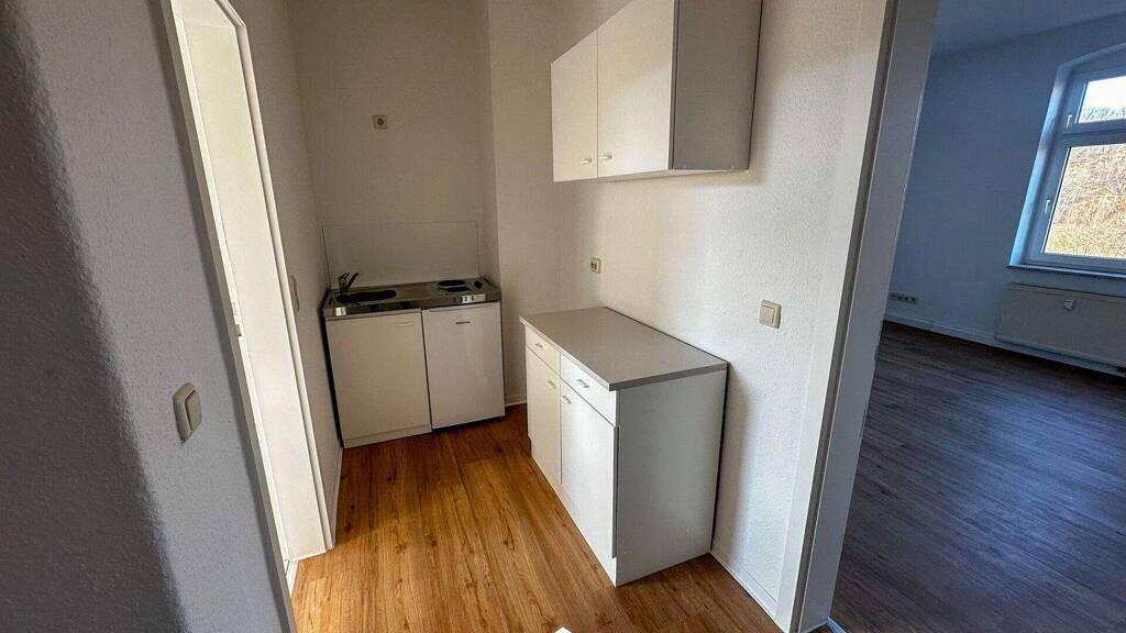 Diese kleine 1-Raum-Wohnung befindet sich in der 2. Etage eines Mehrfamilienhauses. Sie besteht aus einem Flur mit einer kleinen Einbauküche, einem Wohn-/Schlafzimmer und einem geräumigen Badezimmer mit Badewanne und Fenster.
