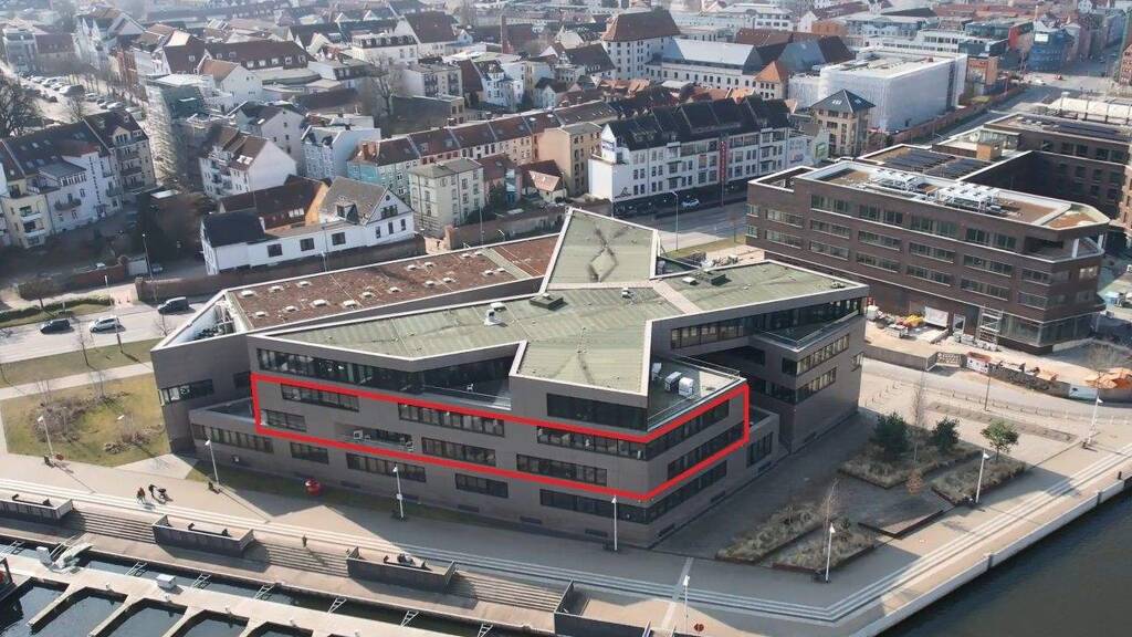 Exklusive moderne Büroflächen mit Wasserblick am Stadthafen Rostock zu mieten. Die Büroflächen sind aktuell möbliert und können nach Absprache entsprechend angemietet werden. Die Büroflächen erstrecken sich über das 1. und 2. Obergeschoss des zweiten Gebäudeteils.