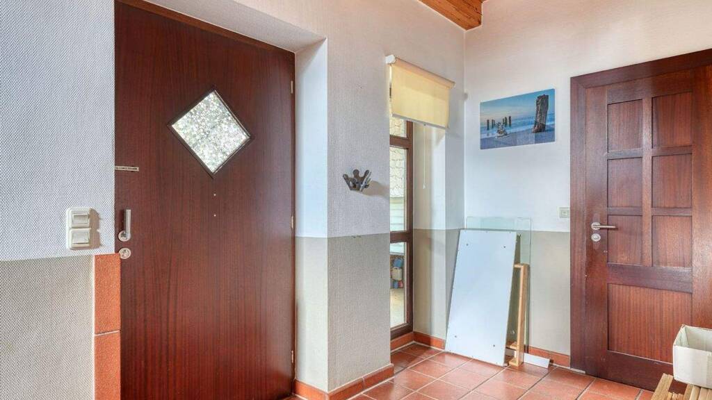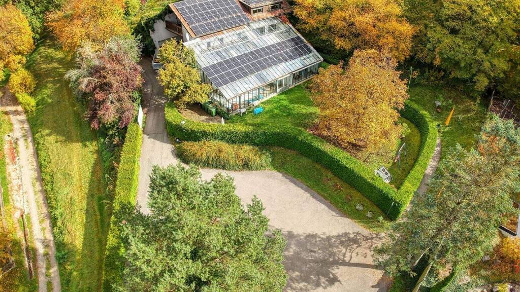 Das Glashaus mit Innenpool von etwa 7 mal 3,5 Metern wird über eine Luftwärmepumpe beheizt. Darunter liegt eine Volletage von rund 120 Quadratmetern mit separatem Außenzugang, aktuell als Praxis genutzt. Empfang, Wartebereich, WC und drei Räume sind vorhanden, die Fläche kann ohne Eingriff als großzügige Einliegerwohnung gestaltet werden.