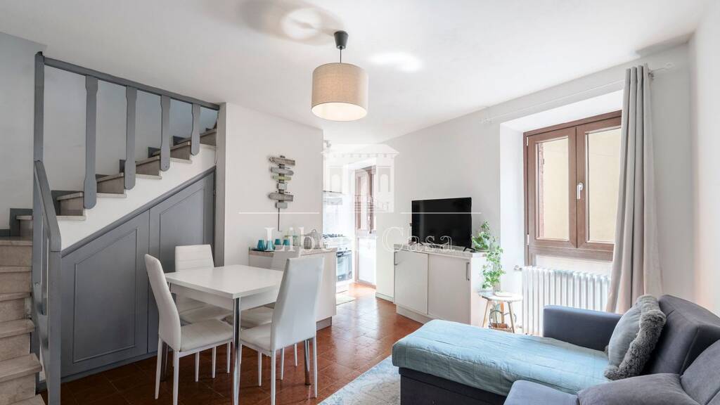 Das Haus öffnet sich mit einem gemütlichen Wohnbereich mit offener Küche, einer raffinierten Umgebung, die dank der großen Fenster sehr hell ist; ein praktischer Abstellraum mit Waschküche unter der Treppe vervollständigt die Etage. Über eine Innentreppe gelangt man in den Schlafbereich, der sich aus einem geräumigen Schlafzimmer mit Doppelbett, einem charmanten Raum mit hoher Decke und einem kürzlich renovierten Badezimmer mit Fenster und Dusche zusammensetzt. Das Gebäude bietet die Möglichkeit, einen Gemeinschaftsraum für Fahrräder zu nutzen.