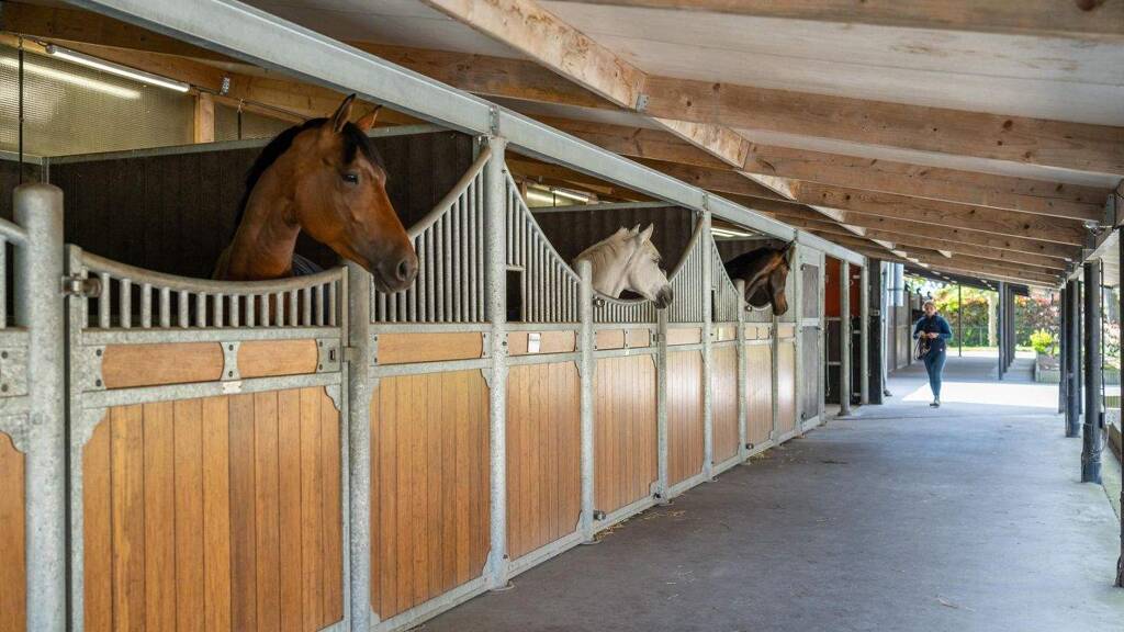 the horse stable is further divided into three units with a total of 20 horse stalls. the insulated stable is constructed of masonry with steel trusses and also has a tiled roof. french doors provide access to the yard from all units. in addition to 11 horse stalls, the first stable unit also has 4 washing areas, a tack room, a laundry room and a toilet. the stalls (approx. 4x4 metres) are equipped with partly plastic and partly galvanised front walls with sliding doors and brick partition walls. six stalls have an outside hatch. stable section ii has six horse stalls (approx. 4x4 metres) with partly plastic and partly galvanised front walls with sliding doors and concrete partition walls. the unit also features attractive wooden trusses. the third stable section has 3 more stalls, all of which have an outside hatch. the stalls have partly plastic and partly galvanised front walls with sliding doors and concrete partition walls.